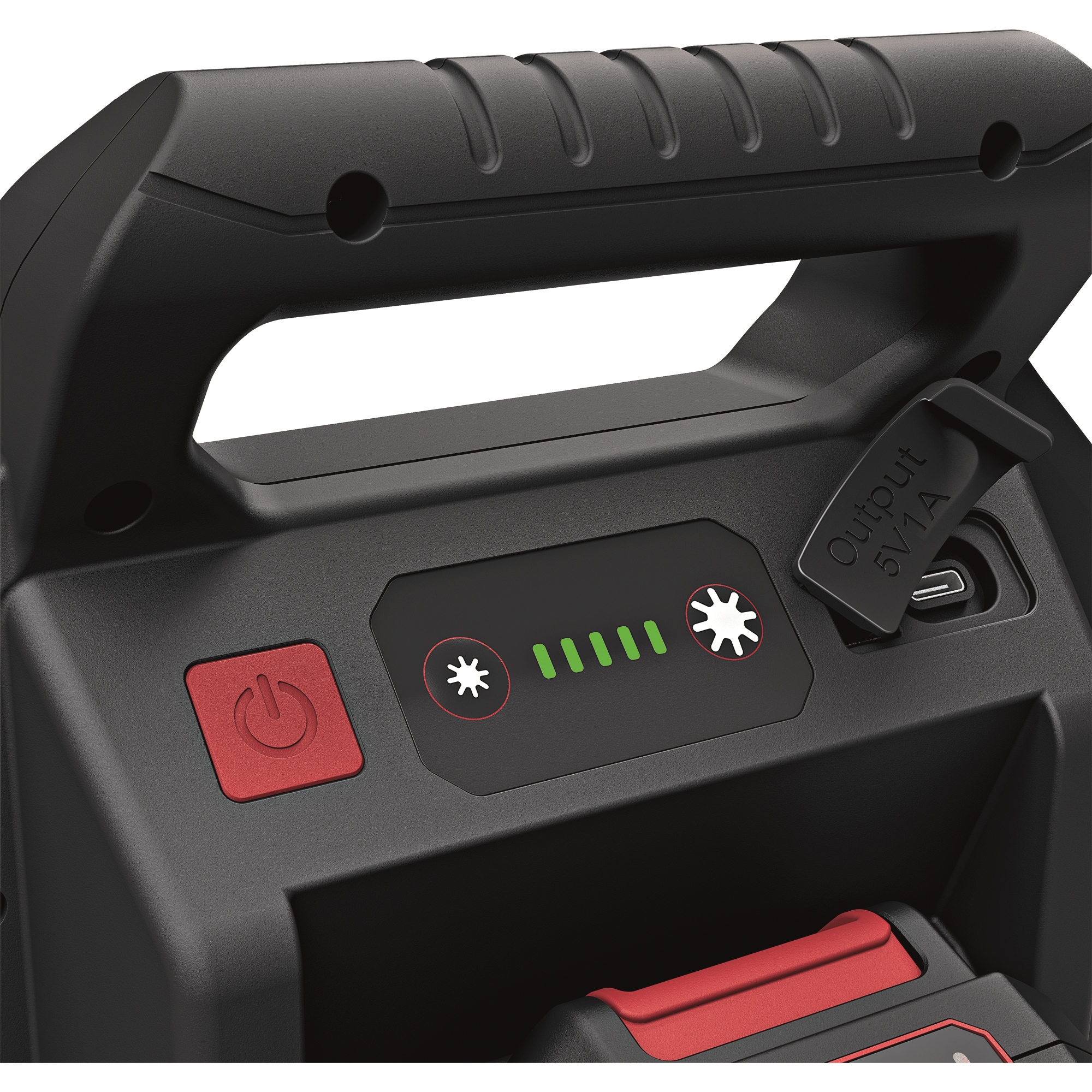 Potente proiettore a batteria da 5.000 Lumen con 5 livelli di luminosità più modalità ECO. Con funzione Memory, la luce si riaccende con l'ultimo livello impostato