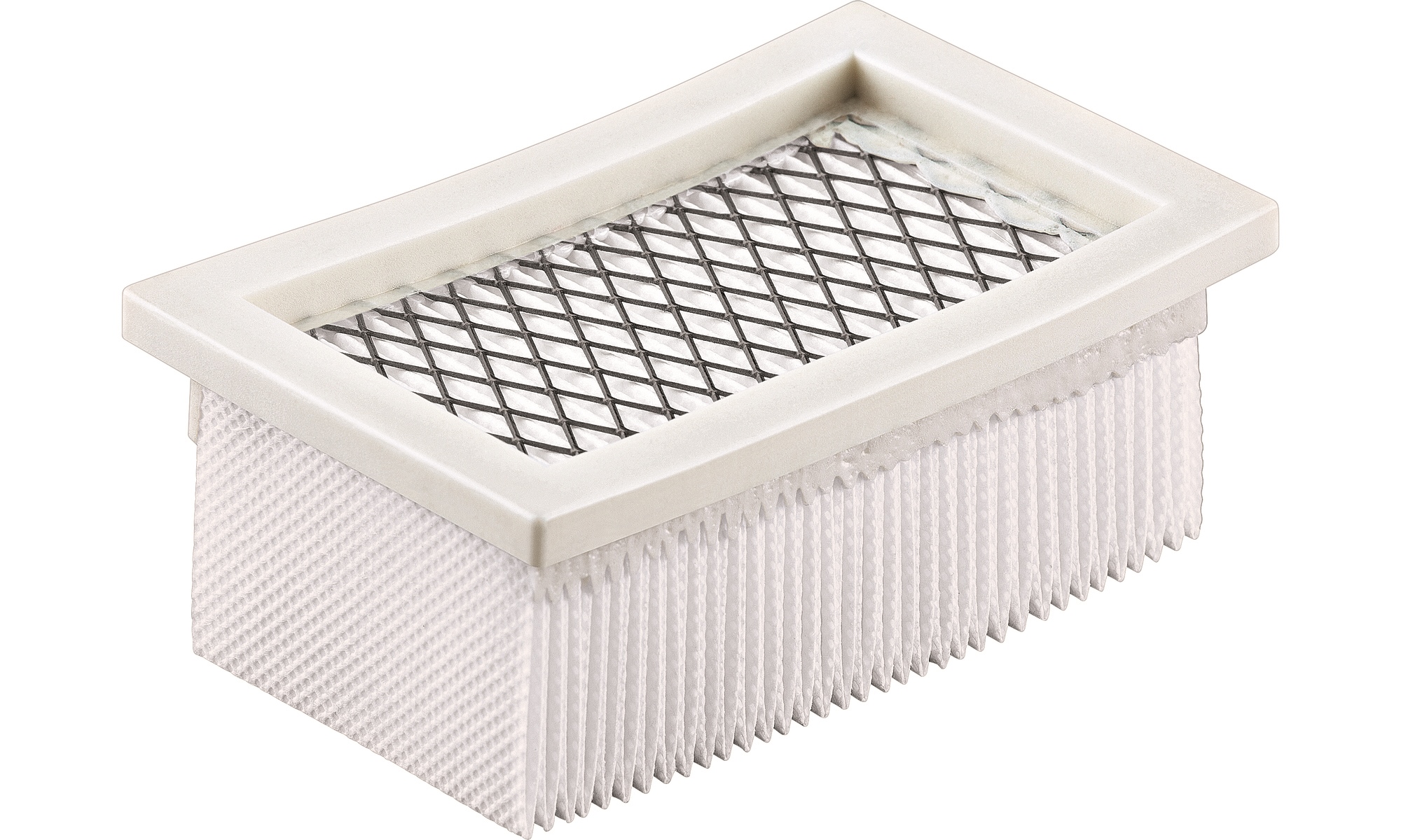 Filtro di carta pieghettato piatto di classe H/HEPA 13. Realizzato in un materiale speciale con un tasso di penetrazione < 0,005%. Superficie repellente allo sporco e lunga durata.