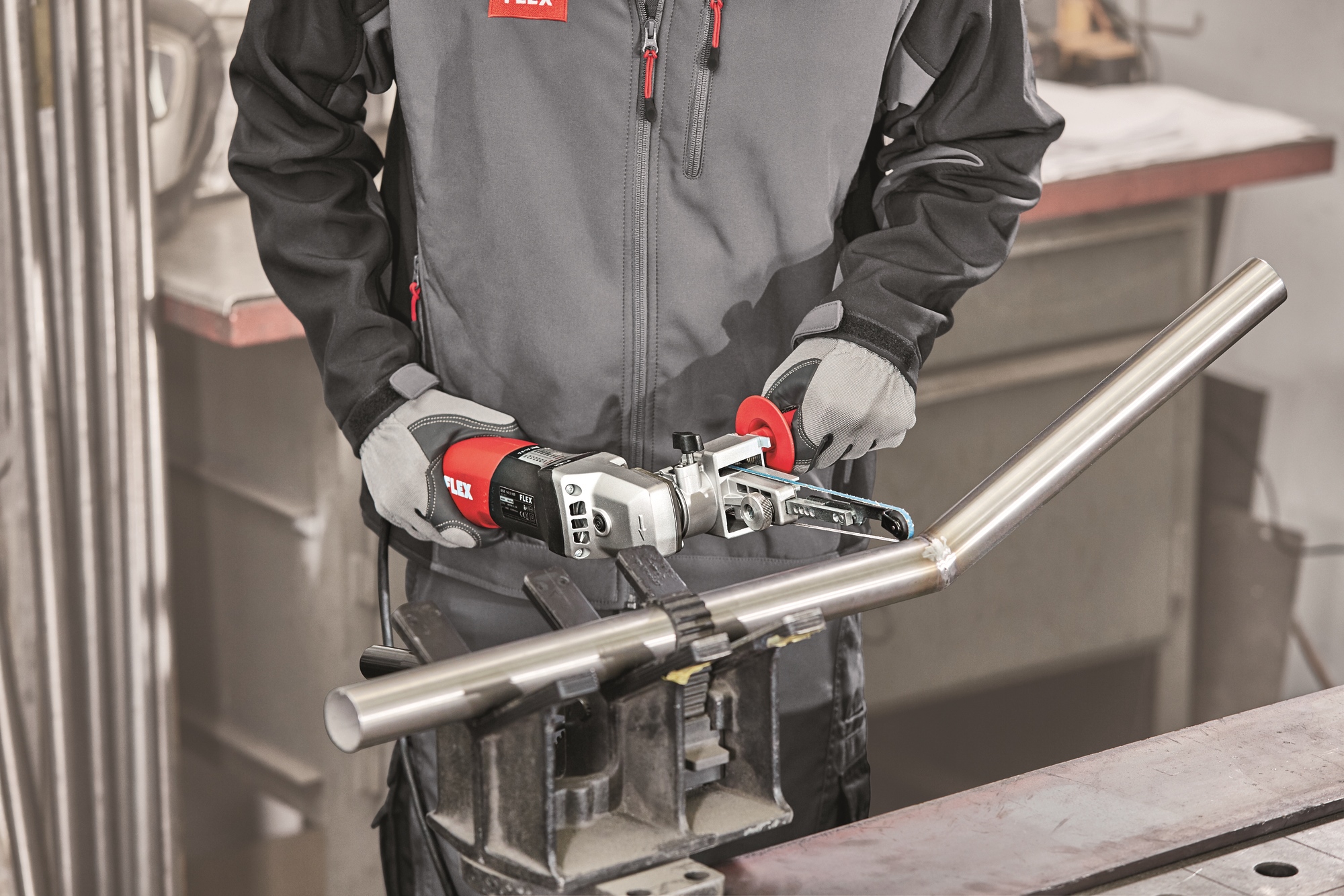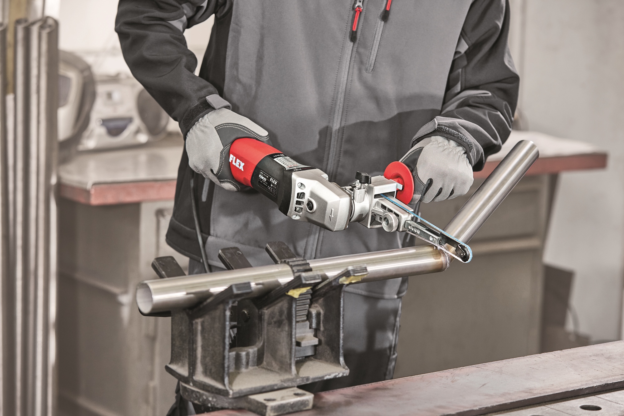 Accessoire unique avec raccord rapide pour changer sans outil les quatre accessoires du système pour le satinage et le ponçage de tubes, pour le ponçage avec une lime à bande ou une ponceuse à gorge