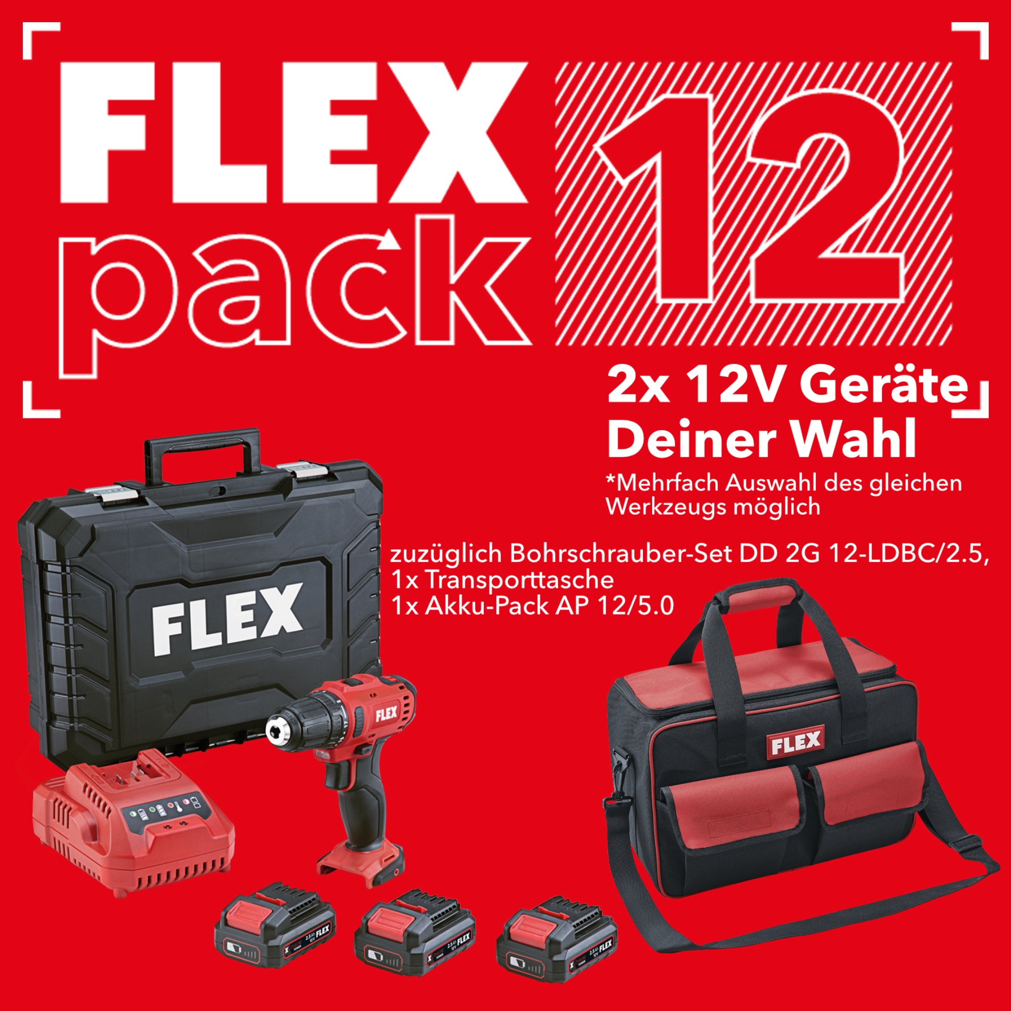 Choisissez 2 appareils supplémentaires parmi 8 appareils puissants à batterie 12 V - avec le FLEXPACK12.