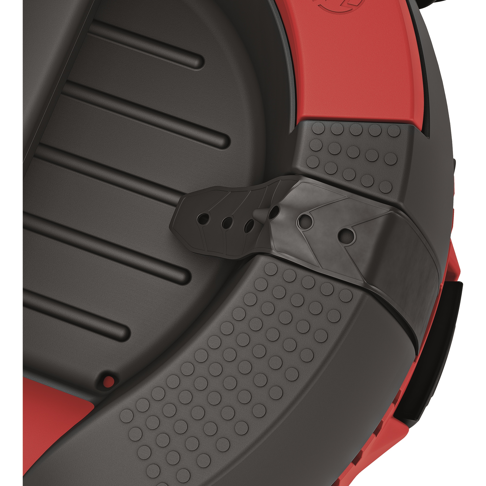Équipé de grandes roues et de deux roulettes pivotantes.