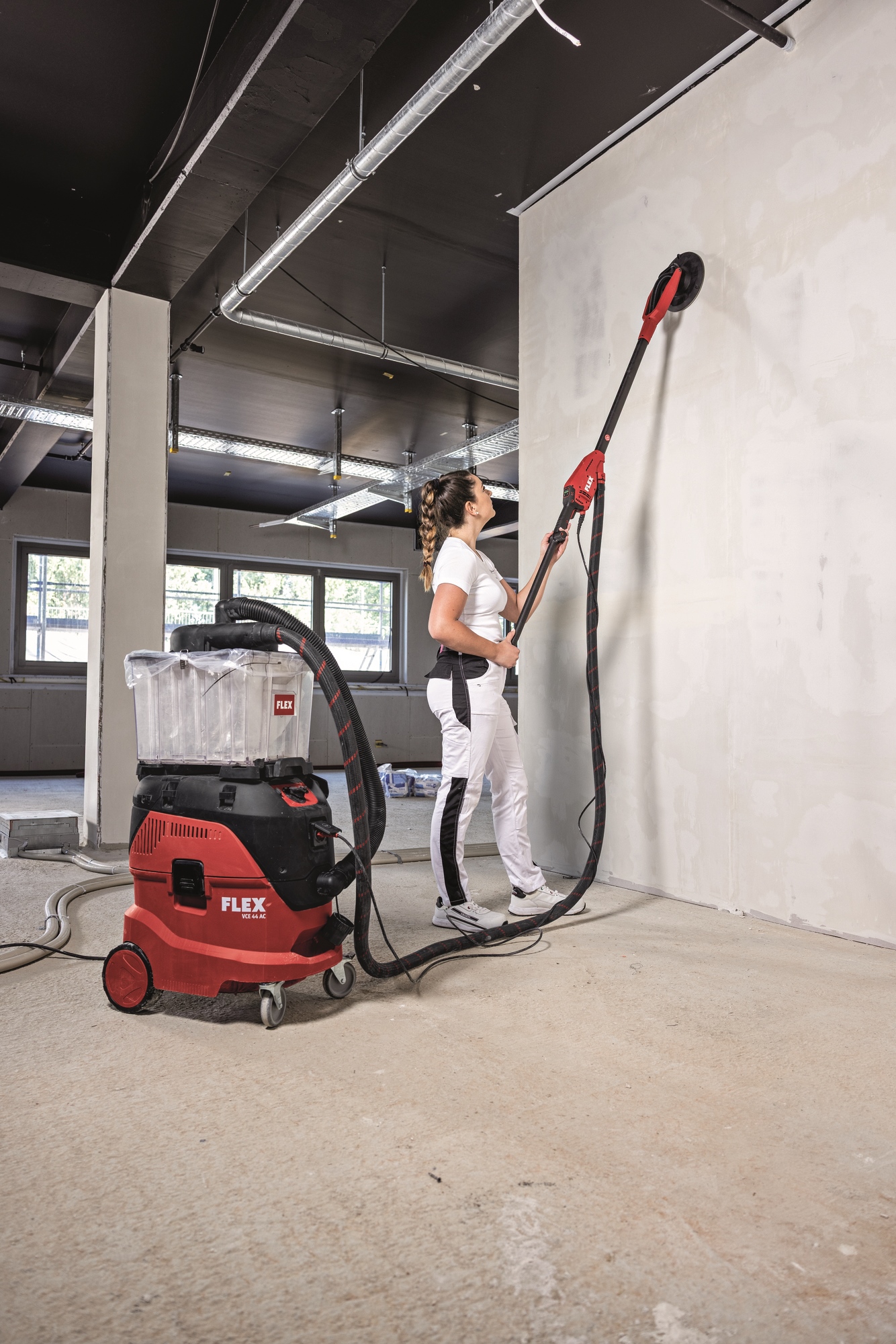 La FLEX GE 6 X-EC è una levigatrice sofisticata per pareti e soffitti, dotata di un movimento di levigatura eccentrico, progettata per lavori professionali di tinteggiatura e posa di cartongesso. Grazie al suo peso ridotto, all'eccellente ergonomia e alla precisa tecnologia eccentrica, la Giraffe® offre un risultato di levigatura particolarmente fine e uniforme, ideale per lavori di finitura di alta qualità su pareti e soffitti.